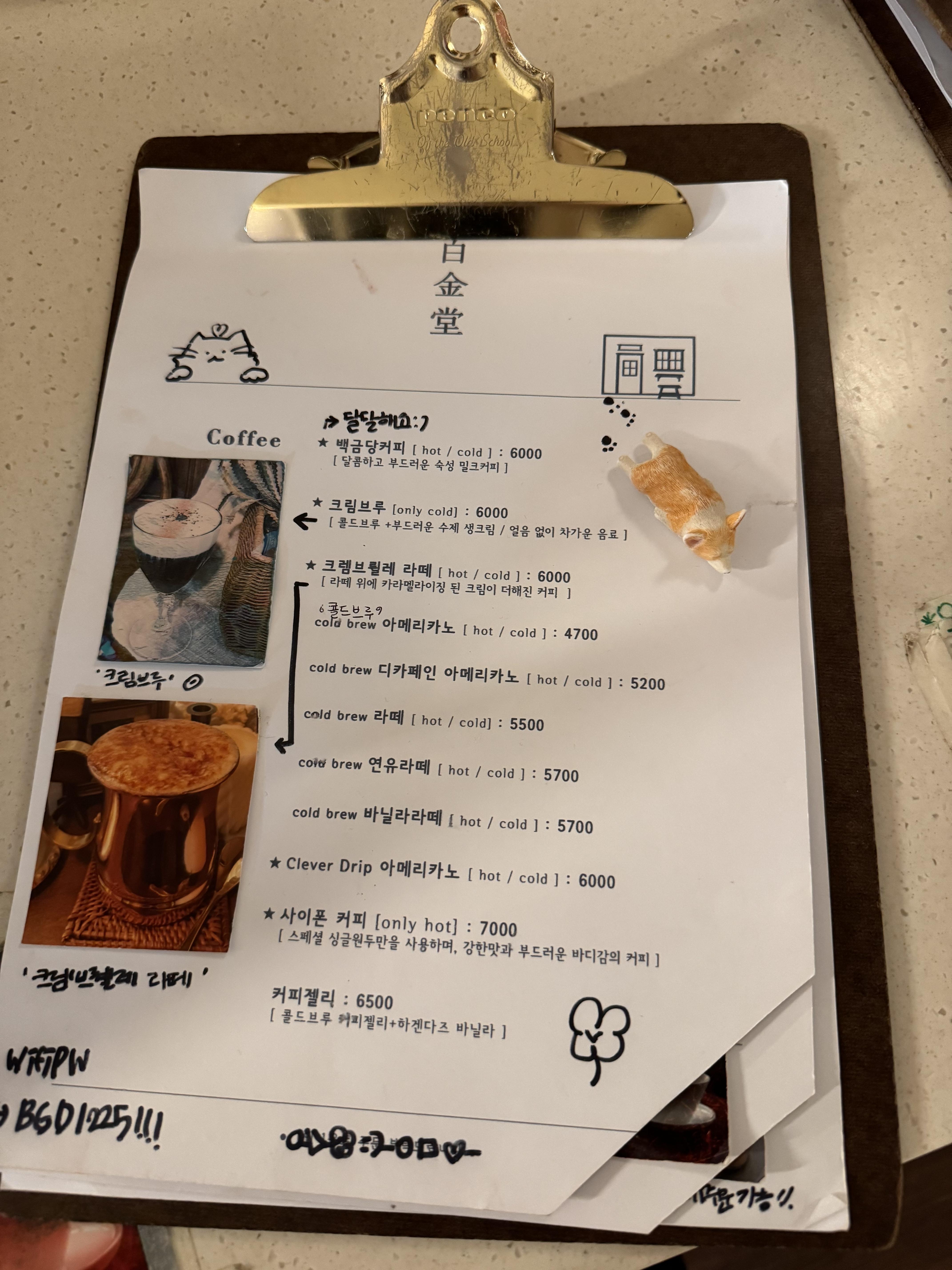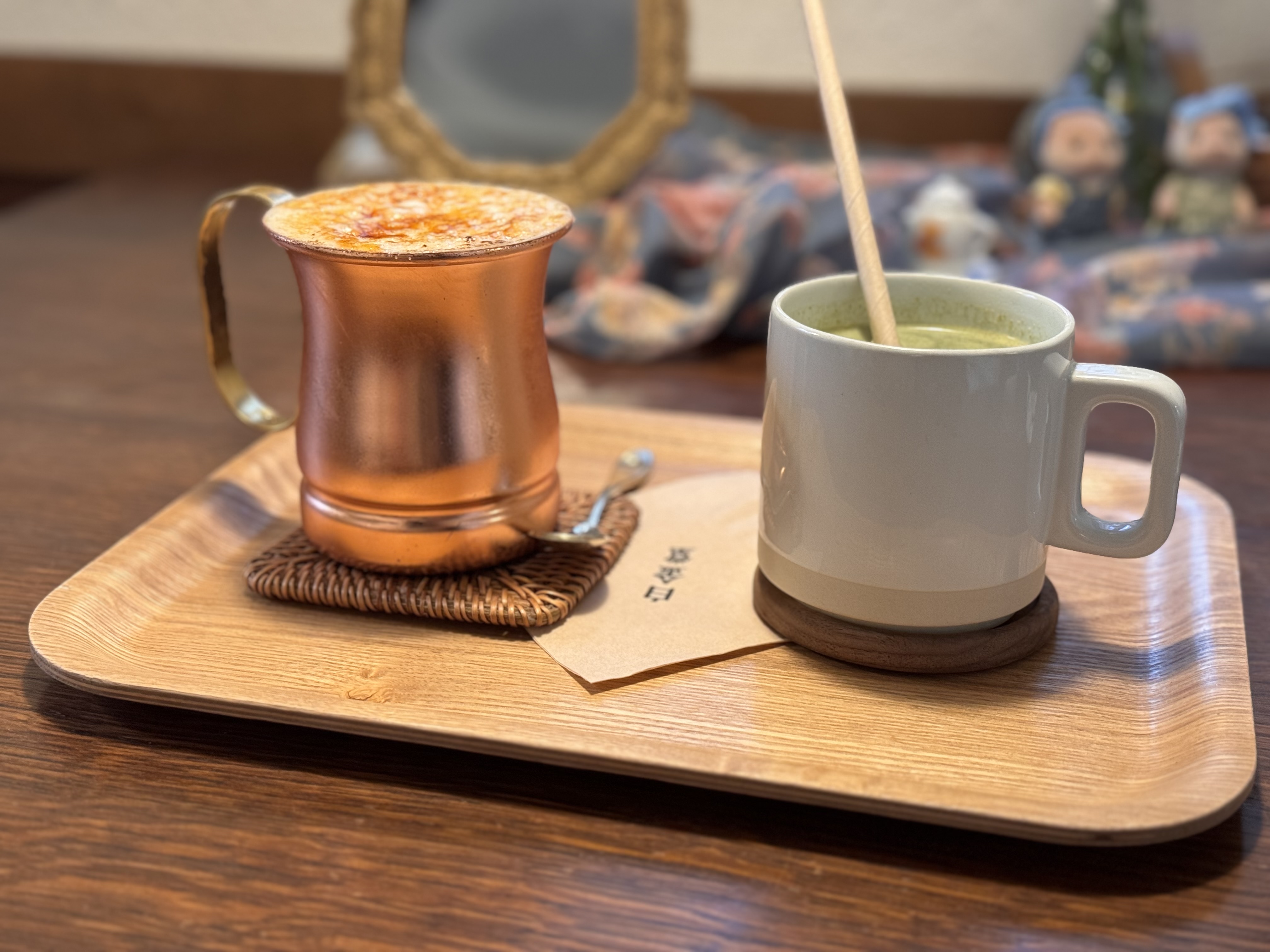 백금당에서 추천하는 메뉴는 말차우유와 크렘브륄레 라떼입니다. 라떼 위에 올라간 크림과 설탕 카라멜의 식감이 재미있어서 많은 분들께 사랑받고 있어요.