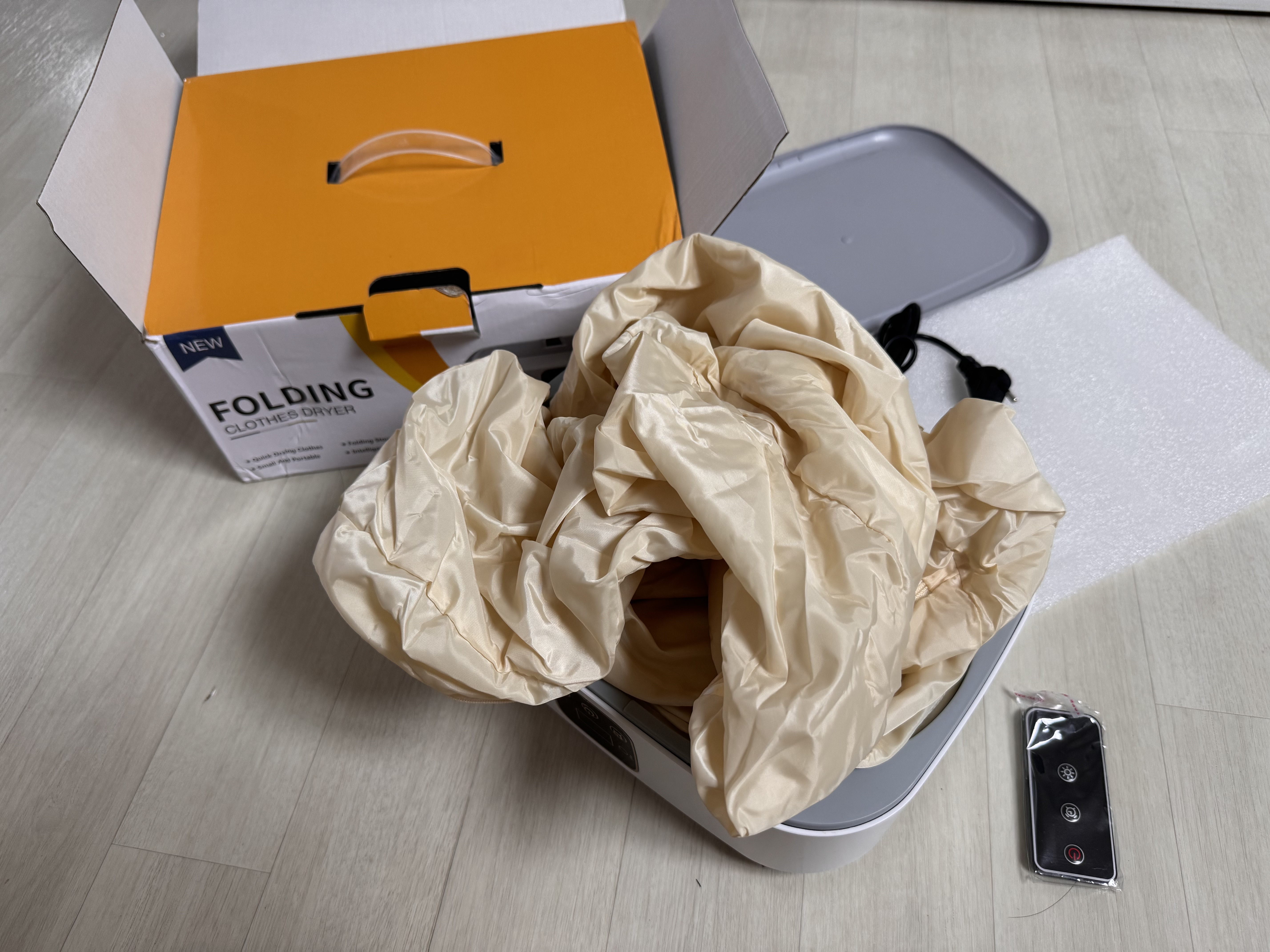 포장 목록: 건조기 x1, 건조 커버 x1, 리모컨 x1, 사용 설명서 x1