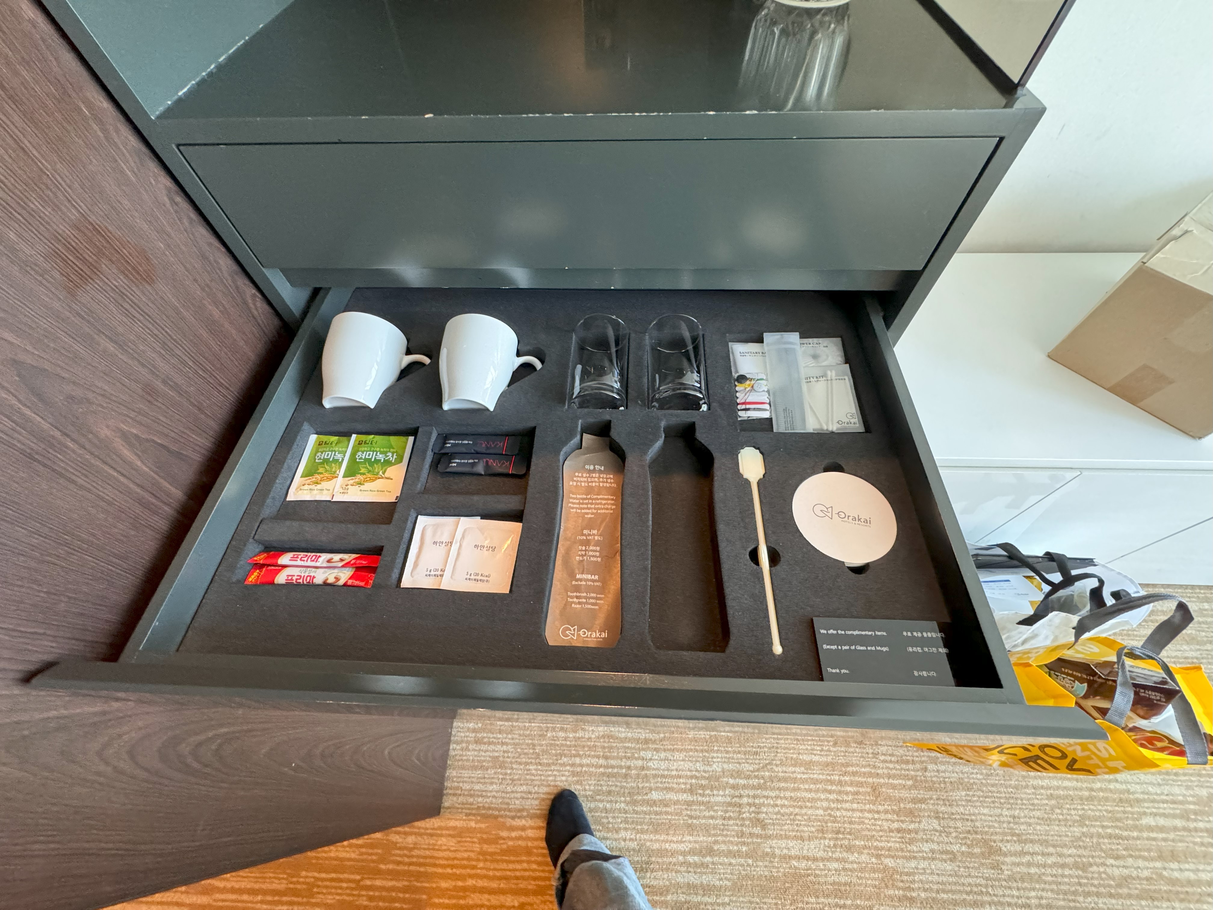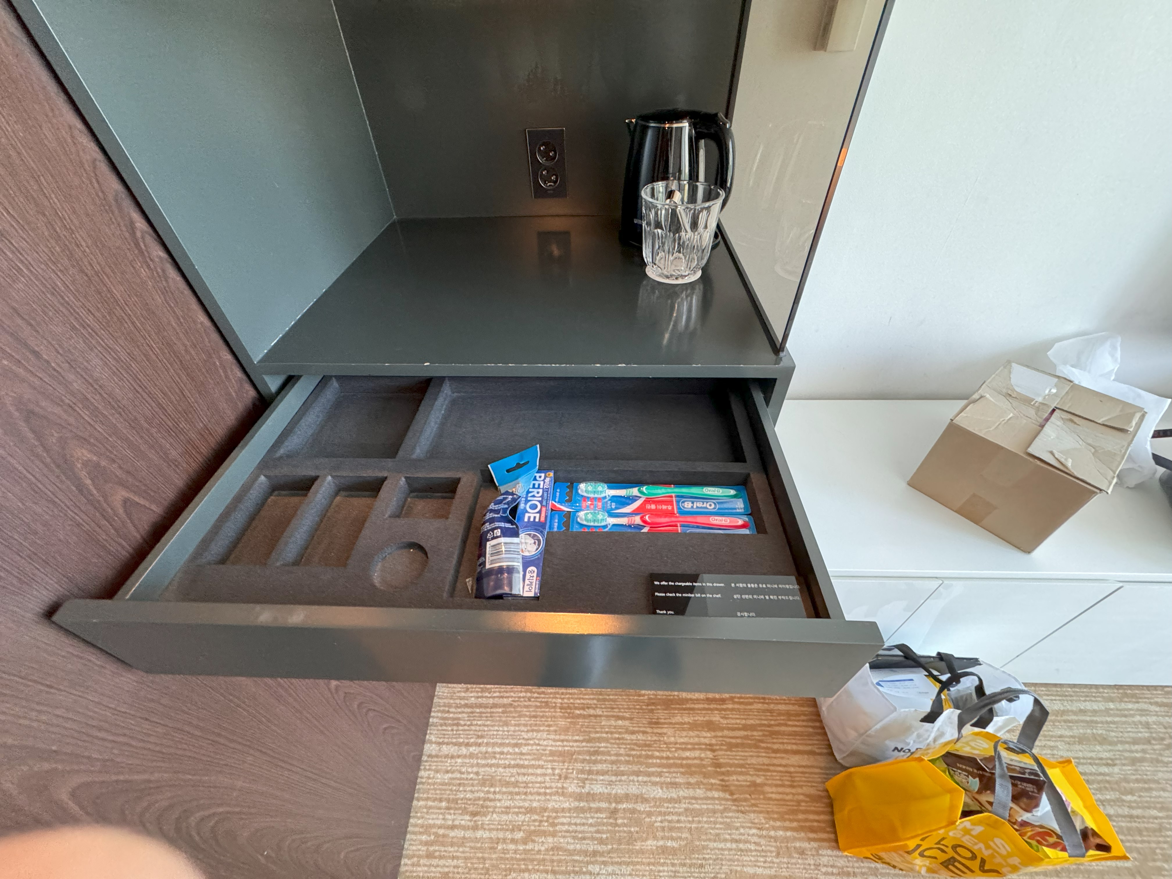 욕실도 청결하게 잘 관리되어 있었고, 필요한 모든 어메니티가 잘 갖추어져 있었지만 컵, 커피, 바느질 용품, 커피포트 등.. 간단한 용품은 무료였고 칫솔, 치약 면도기는 유료였답니다!! 참고하세요!