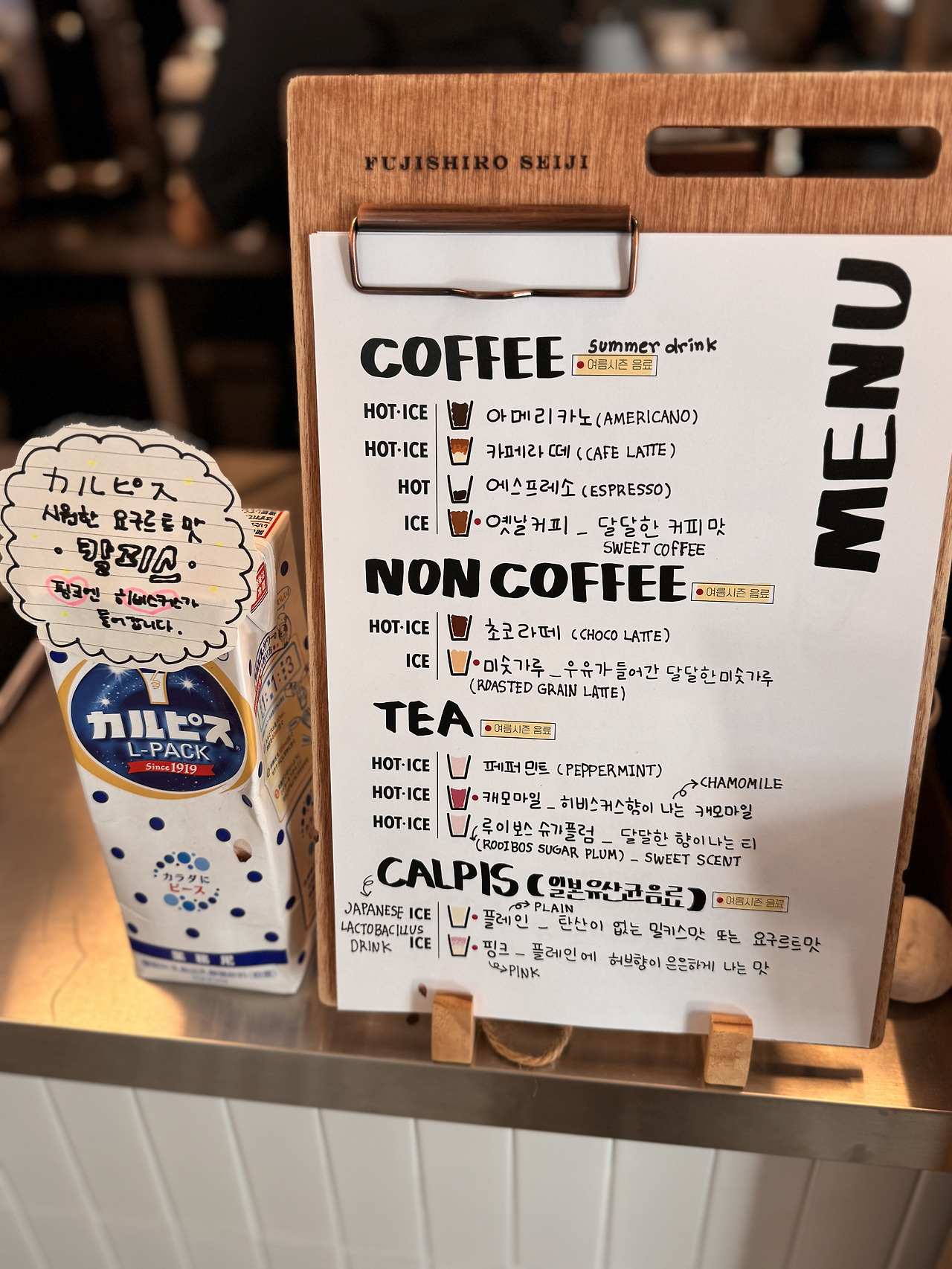 카페 카운터의 모습과 커피와 차, 일본 음료 메뉴들