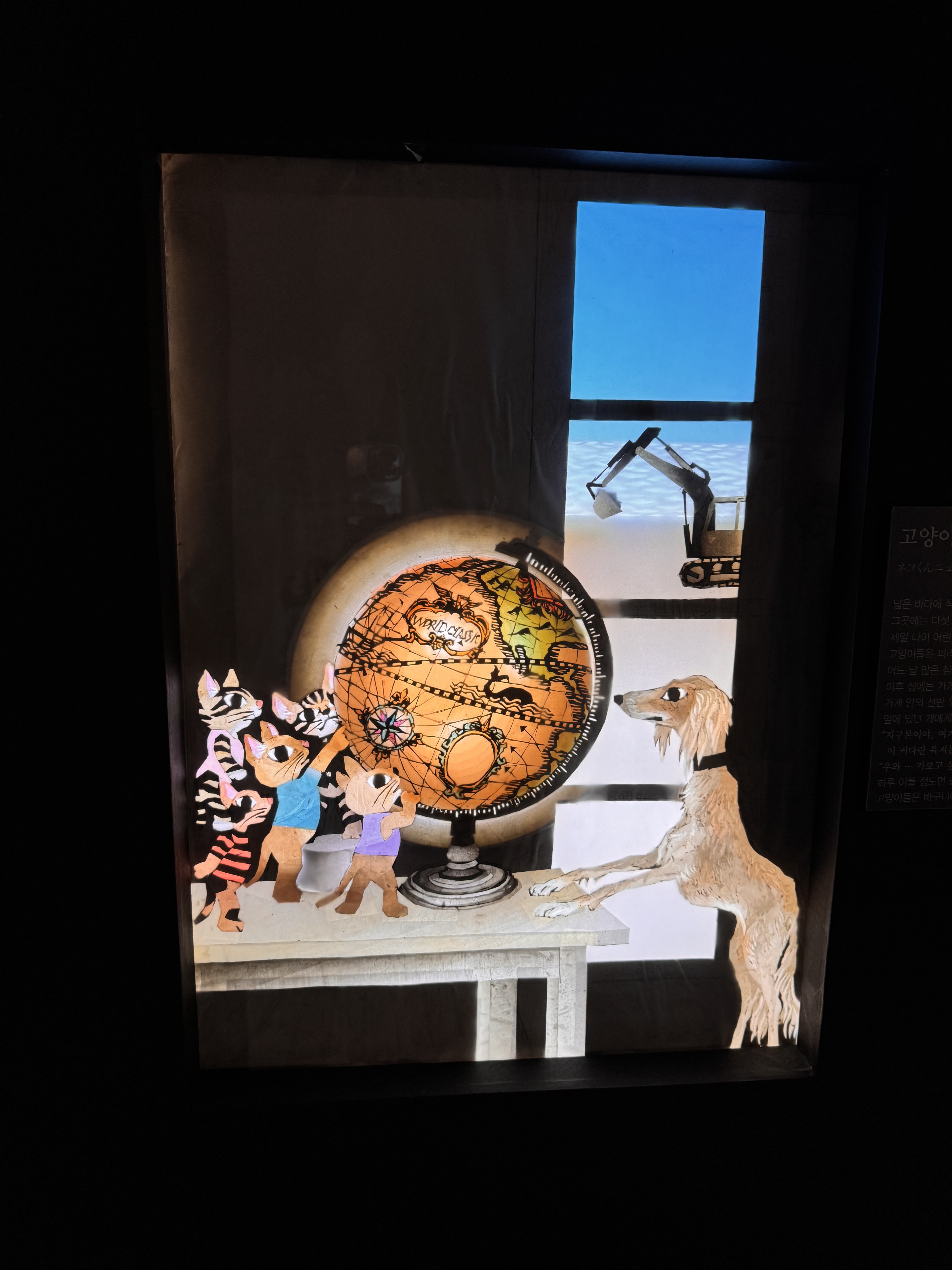 이번 전시회에서는 주로 빛과 그림자를 활용한 작품들이 전시되어 있으며, '고양이 뉴욕에 가다' 시리즈가 메인 테마로 많은 인기를 끌고 있어요. 고양이 캐릭터들이 뉴욕의 다양한 장소를 배경으로 그려진 이 시리즈는 동화 속에서처럼 따뜻한 감정을 느끼게 해줍니다. 그 외에도 '케로용', '풋칭과 차풍' 등의 작품들도 전시되어 있으며, 이들 모두가 독특한 매력을 가지고 있습니다.