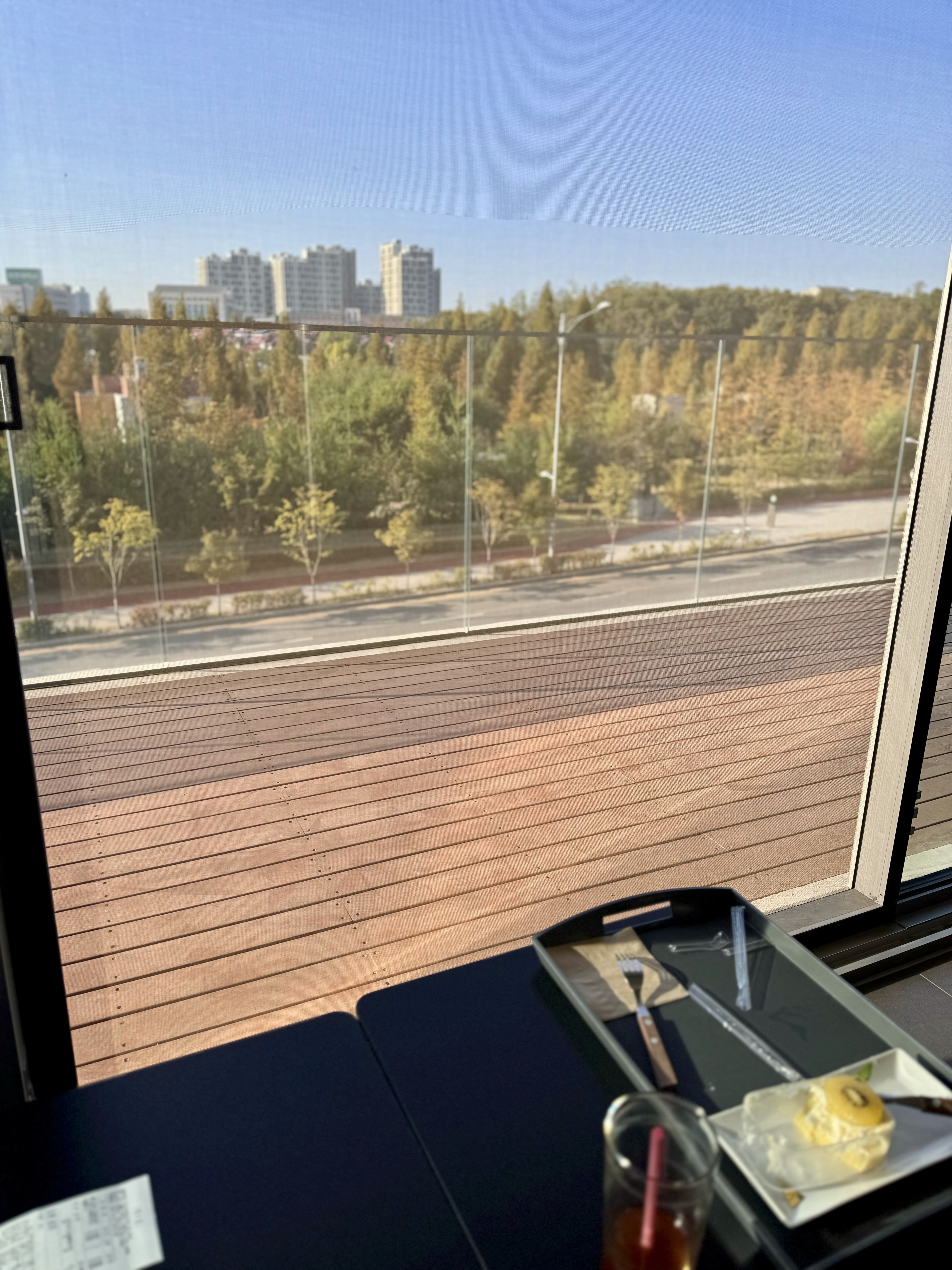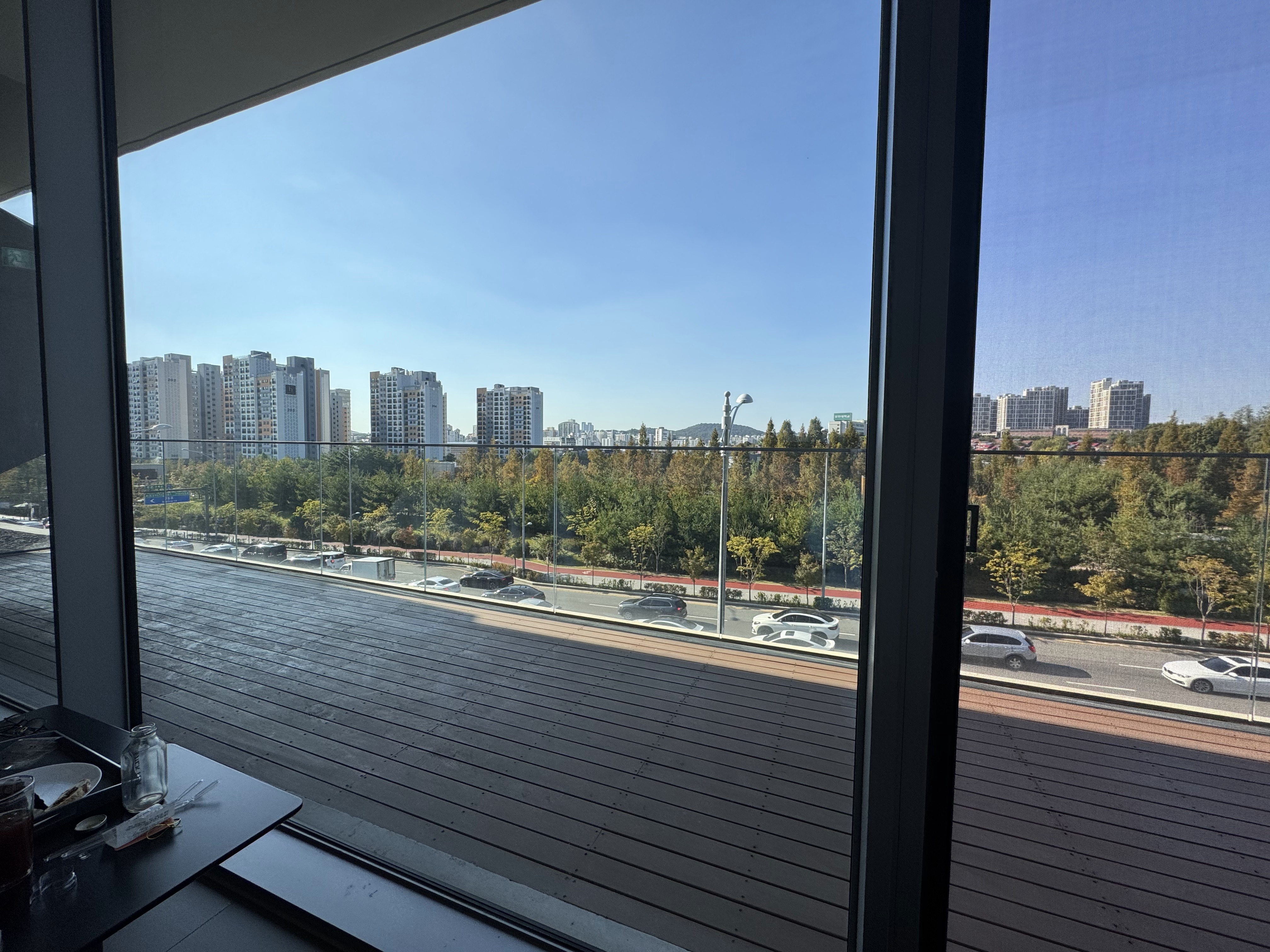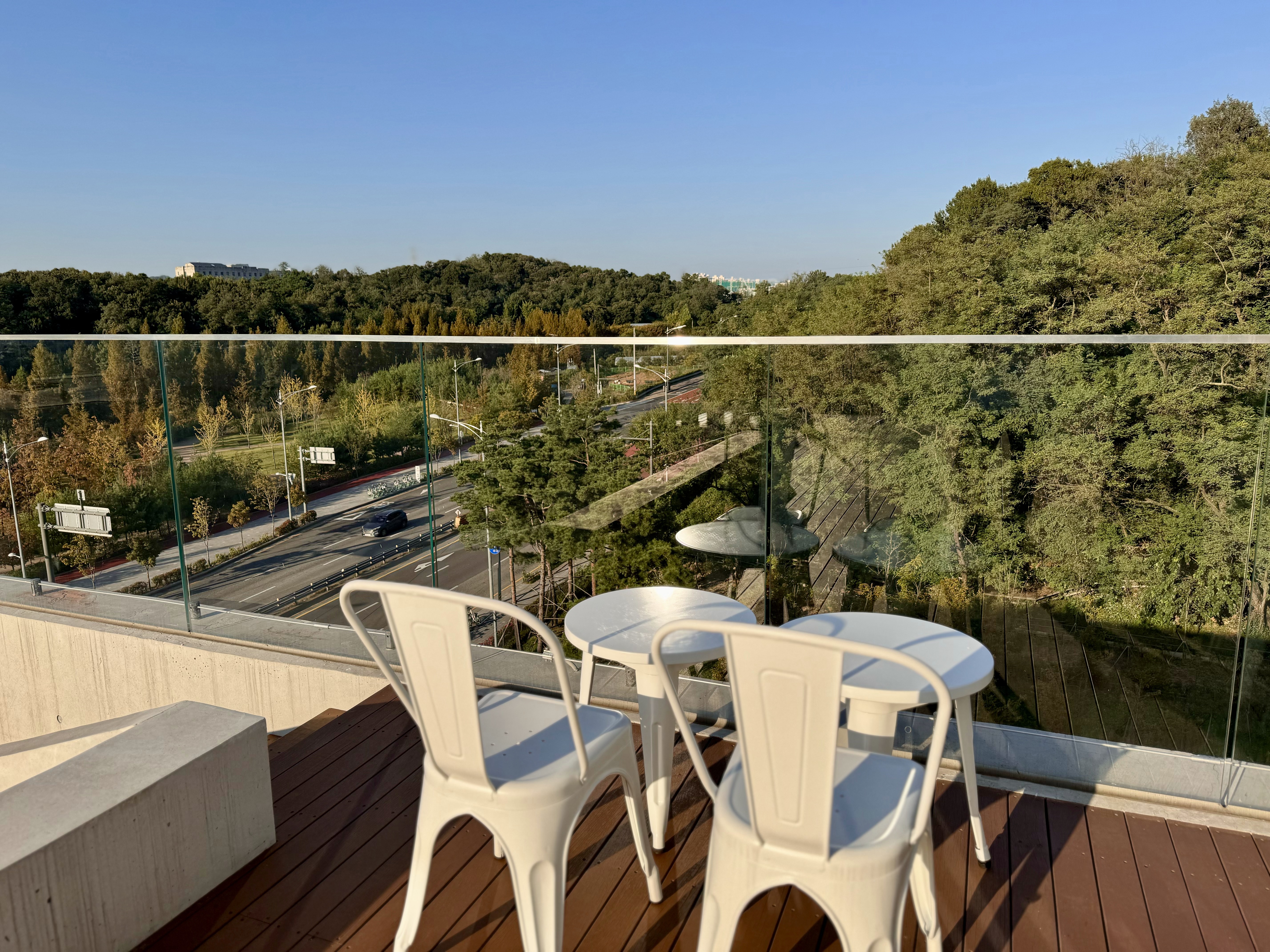 9로 평상의 5층 야외 테라스는 노키즈존이라 조용하게 힐링할 수 있는 공간이에요. 푸른수목원을 바라보며 여유롭게 커피를 마실 수 있어서 친구들이나 연인과 함께하기에 딱이었어요.