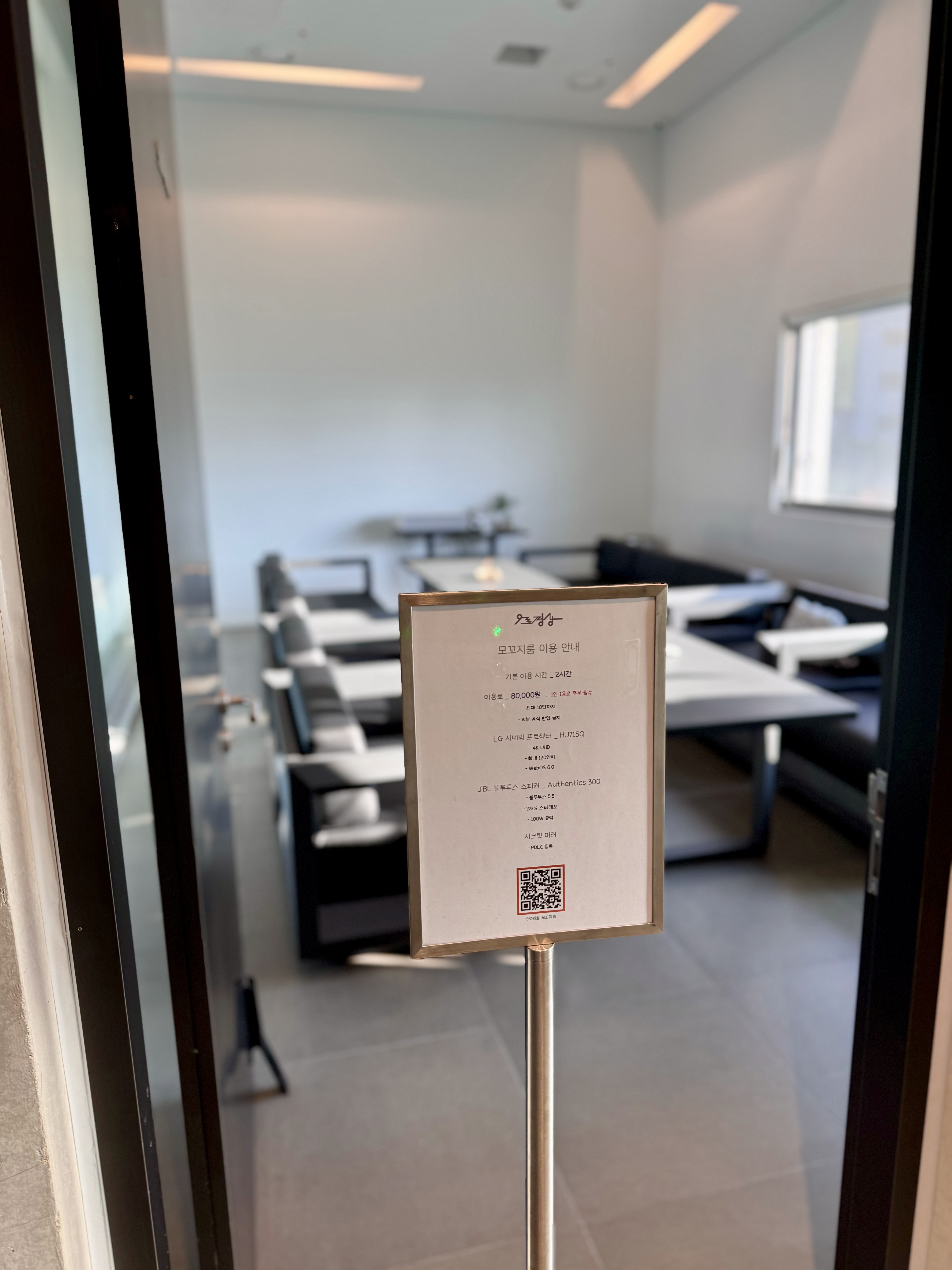 모꼬지룸은 2시간 기준 80,000원이며, 최대 10인까지 이용할 수 있습니다. 1인당 음료 주문은 필수이며, 외부 음식 반입은 금지됩니다. 추가 시간은 1시간당 30,000원이 발생하며, LG 시네빔 프로젝터와 JBL 블루투스 스피커 등 고급 장비가 완비되어 있어 소규모 모임이나 이벤트에 적합한 공간입니다.
