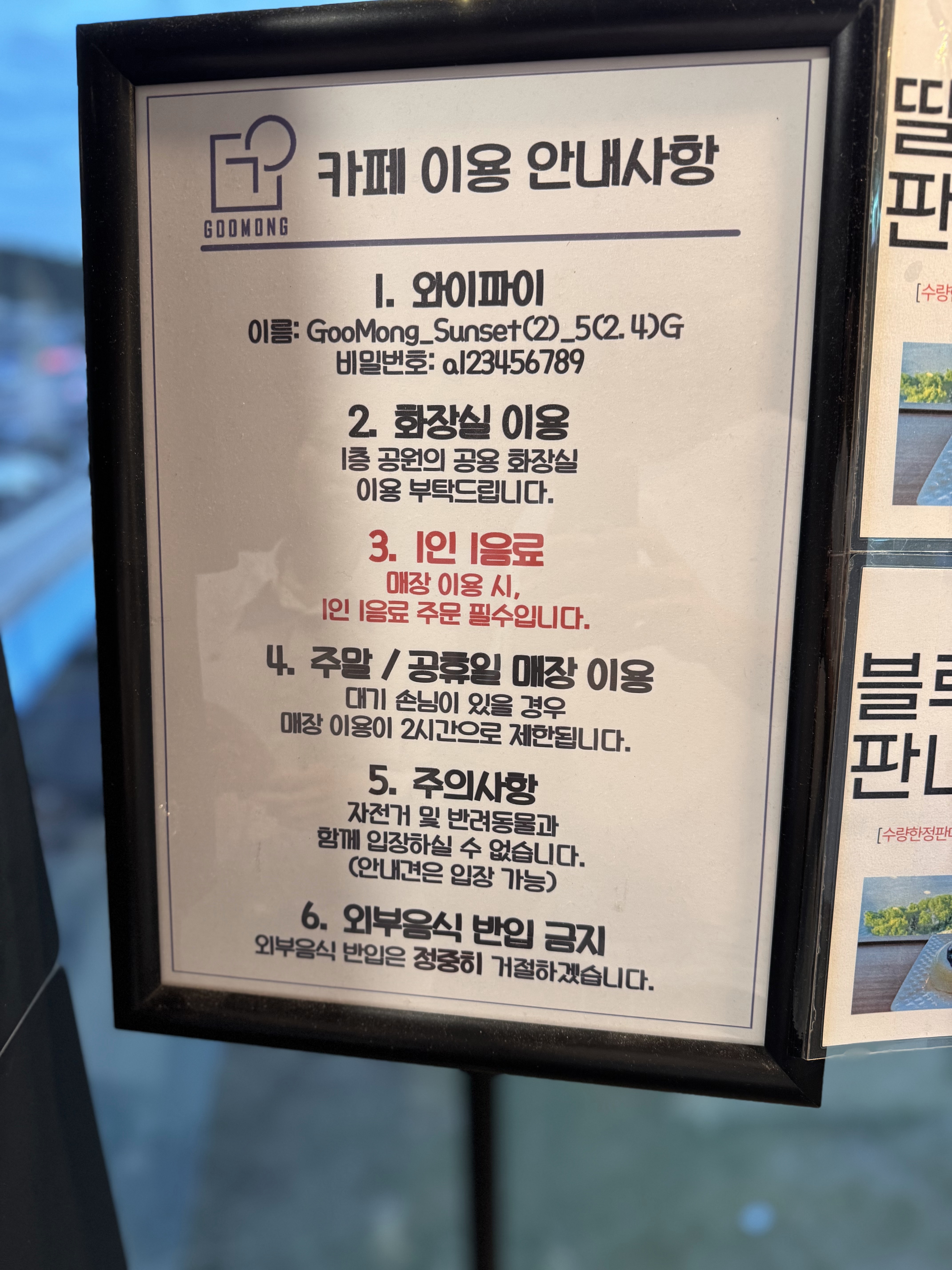 - 1인 1음료: 매장 이용 시 1인 1음료 주문은 필수입니다.