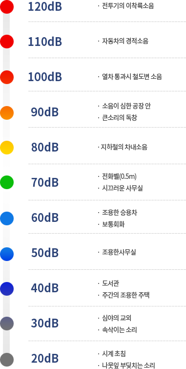 | 소음크기 | 음원의 예 | 소음의 영향 | 비교 |