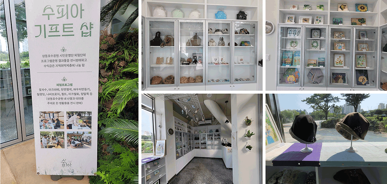 2. 기념품 판매소 : 기념품 판매소에서는 상동호수공원 시민운영단이 운영하는 체험프로그램의 결과물을 전시하고 판매한답니다. 이 수익금은 지역 취약층에서 나눔을 하고 있어요.