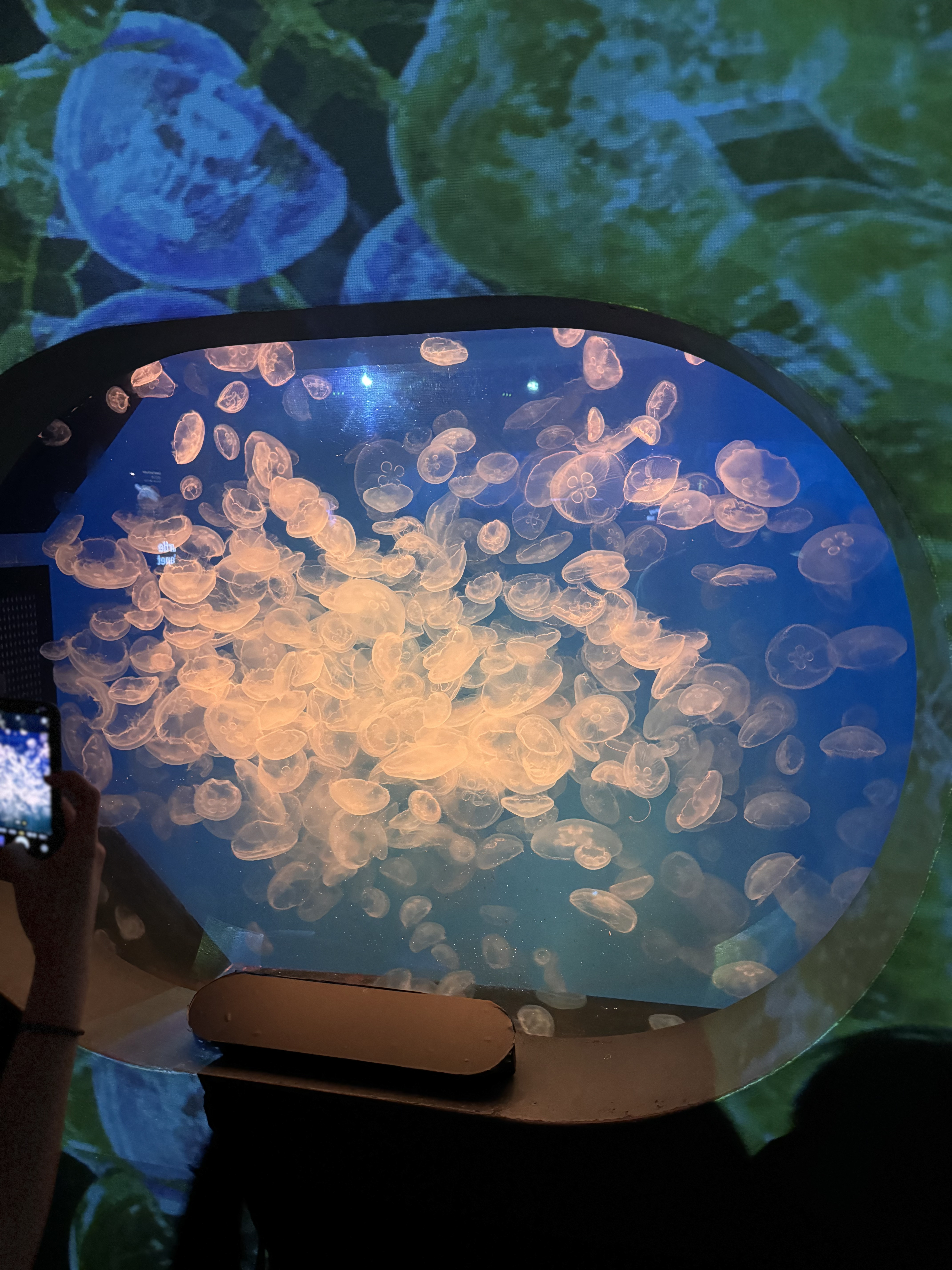 전시회랑 전망대를 보고서 내려왔는데 그 사이에 사람들이 더 많아졌어요. 정말 많은 사람들이 마지막으로 63빌딩을 보려고 찾아온 거 같아요! 그래도 저희도 어쩔 수 없이 줄을 서서 20분 정도 기다리고 입장했답니다. 아쿠아리움에 들어가니, 다양한 물고기들과 해양 생물들이 저희를 맞이해 주었어요. 펭귄들이 걸어 다니는 모습도 정말 귀여웠고.